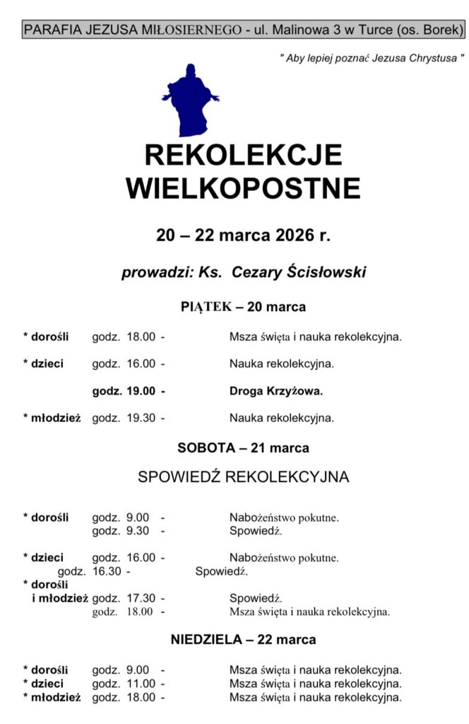 4. W gablotach i na naszej stronie internetowej jest wywieszony plan rekolekcji wielkopostnych.